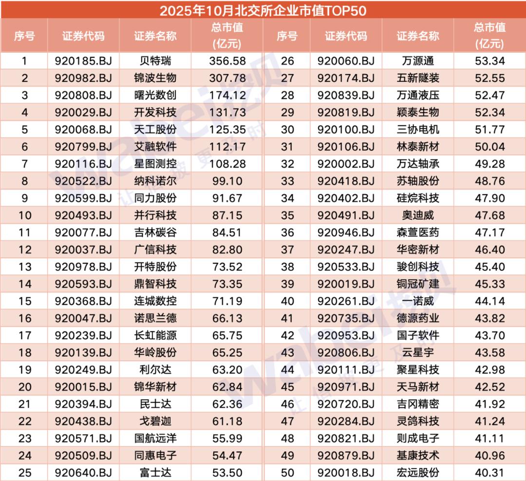 附-2025年10月北交所企业市值TOP50(数据截至10月10日收盘)