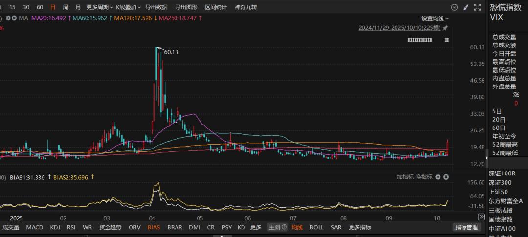 VIX恐慌指数,正式的名称是芝加哥期权交易所波动率指数,做美股的投资者一定非常熟悉,大部分时候跟美股反着来,美股涨它就跌,美股跌它就涨,由于美股的下跌往往以连续暴跌的形式展开,而此时VIX就会出现脉冲式暴涨,比如2020年的疫情大爆发,今年4月的关税大战: