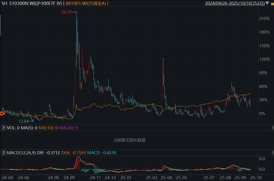 最后再回到A股,国内期权交易推出后,虽然没有官方的VIX指数,但很多软件商有自己统计的主要指数期权的IV(隐含波动率),效果类似。我经常看的是万得的沪300ETF IV和中证1000下月平值IV。