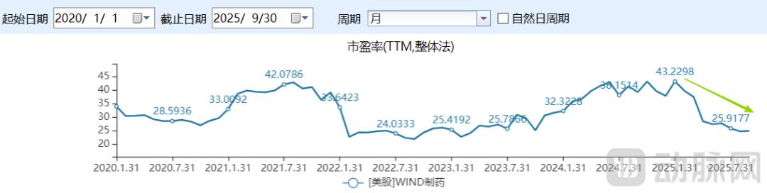 如果说Biotech公司的不景气或多或少是受到了中国创新药的冲击,那么美国制药企业的估值水平则深刻反映了投资者的悲观预期。万得统计的美股制药企业市盈率目前同样处于底部水平,9月30日的滚动市盈率仅有25.03倍,逼近近年来的新低,而且2025年之后的下降趋势十分明显。而同期A股市场和港股市场制药企业的滚动市盈率分别高达53.57倍、36.24倍。