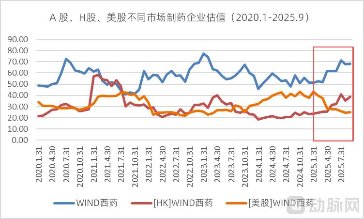 图6. A股、H股、美股西药行业的估值情况(资料来源:wind、动脉网制图)
