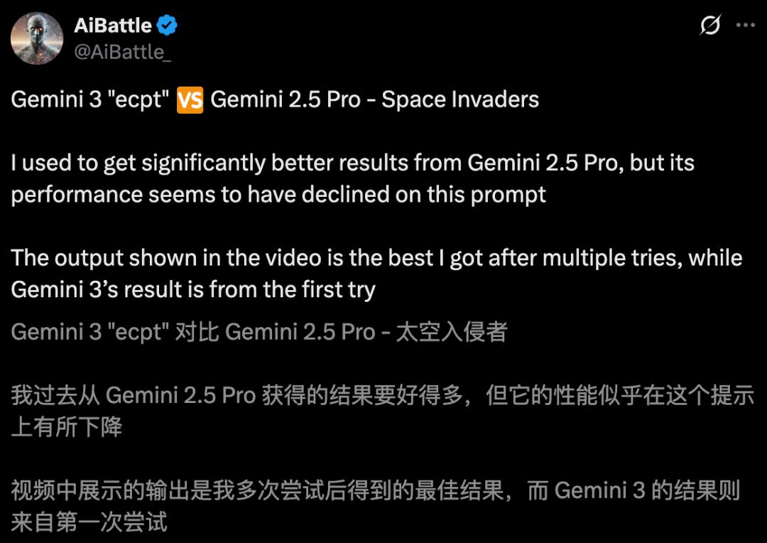 网友还将同一个提示扔给Gemini 2.5 Pro和Gemini 3.0,后者一次尝试就完成了「太空侵略者」的游戏。