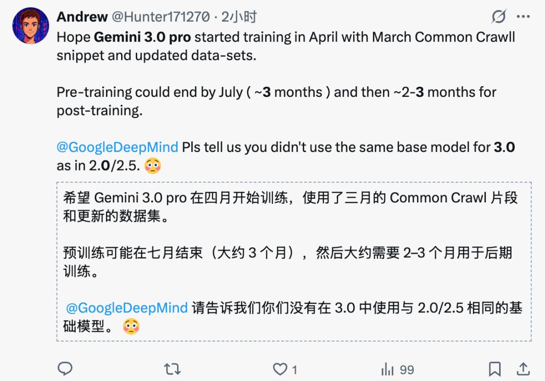 Gemini 3 Pro在今年4月就已经开始训练,预训练在7月左右结束。