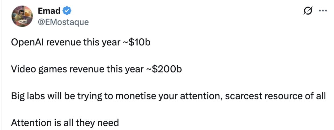OpenAI今年收入约100亿美元,视频游戏行业今年收入约2000亿美元。