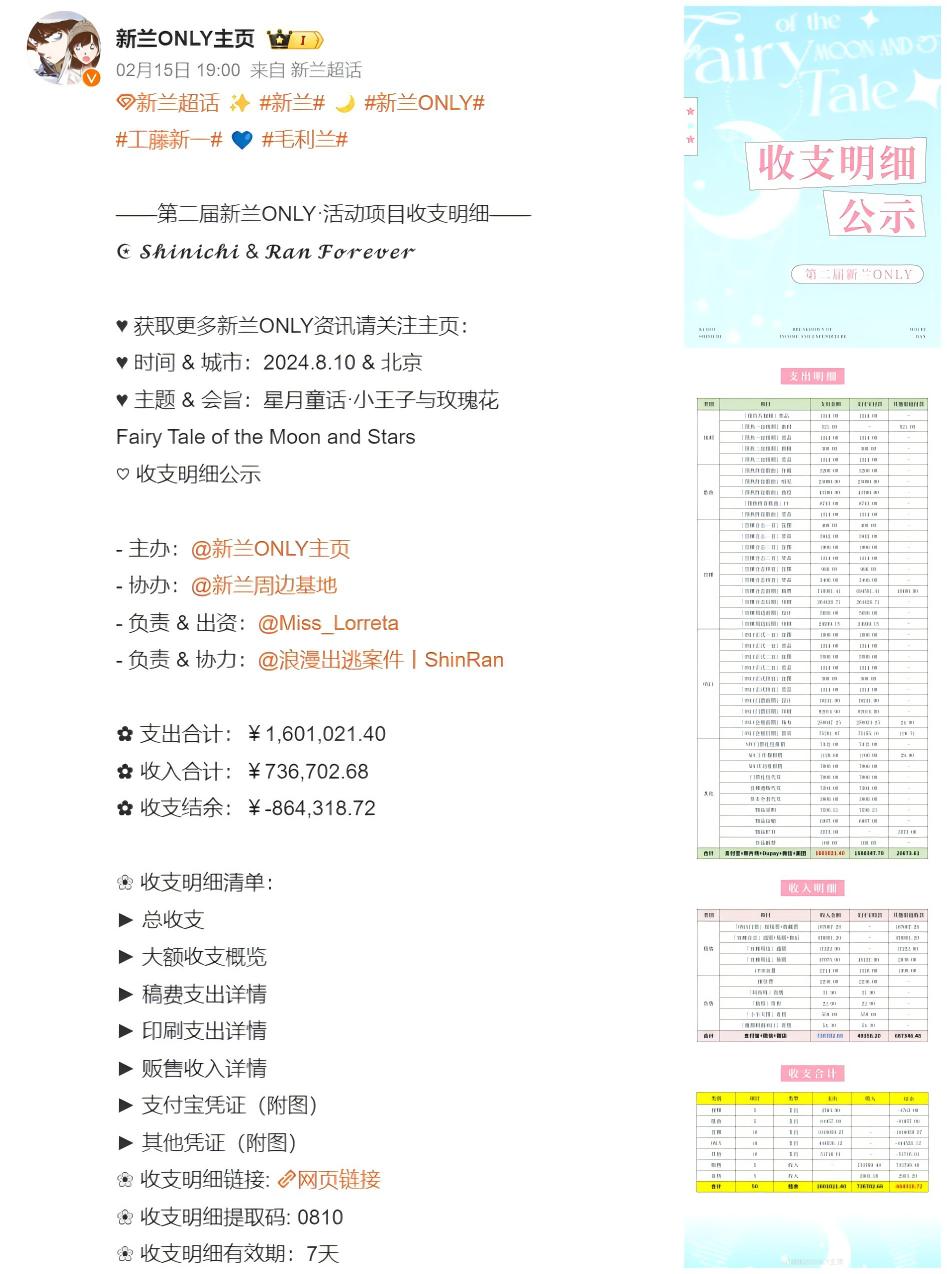 高昂的成本直接带来了巨大的票务压力,更棘手的是前期筹资,一旦签下场地合同启动项目,亏损风险便已实质产生。今年,引起广泛讨论的《名侦探柯南》IP同人展会“第二届新兰ONLY展”便是一个极端案例,根据团队公布的明细,该ONLY展由主办者个人出资高达160万元,最终收入仅为73.6万元,亏损额达86.4万元。