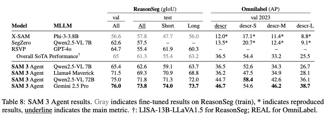 结果显示,SAM 3+MLLM的组合比专门做推理分割的模型效果还要好,并且无需专门的数据做训练。