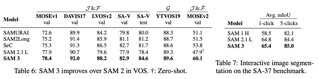 另外,在针对视频的PVS(Promptable Visual Segmentation)任务中,SAM 3的性能也优于SAM 2。