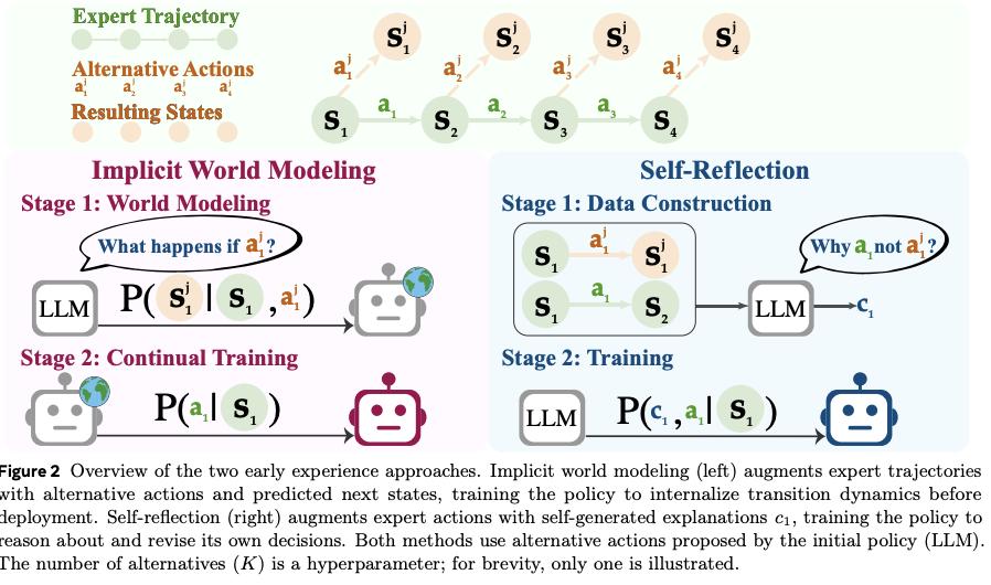 举个例子:让Agent学订机票,传统模仿学习只给它看成功订票的录屏。而“早期经验”会让它主动尝试:点错日期会怎样?填错证件号会怎样?每次尝试后观察环境的反应,比如报错信息、页面跳转、表单状态变化等。