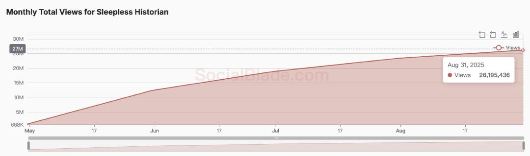 据Social Blade数据显示,截至8月底,“Sleepless Historian”的总播放数超2600万次,预估RPM(每千次播放的收入)在0.265美元到4.25美元之间。