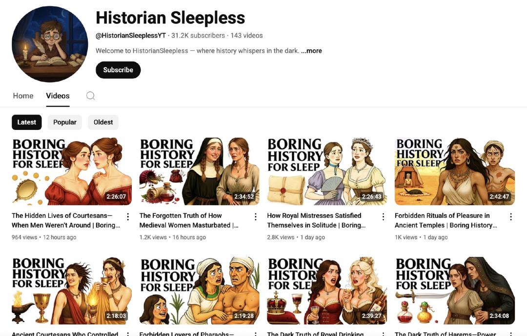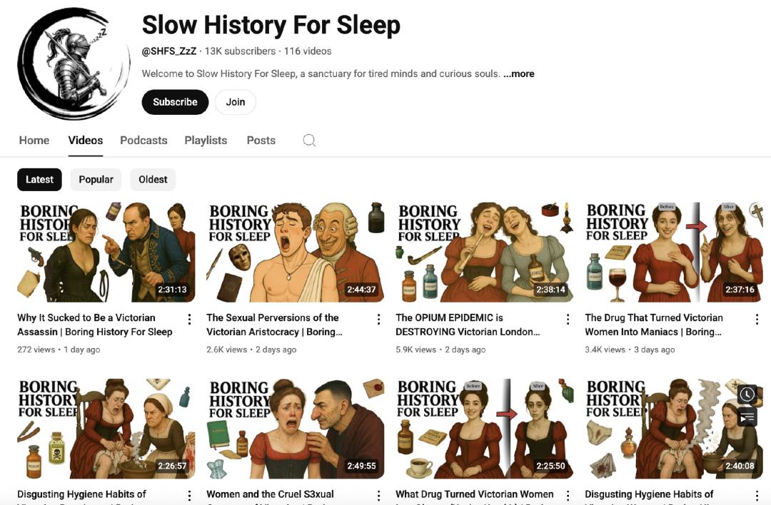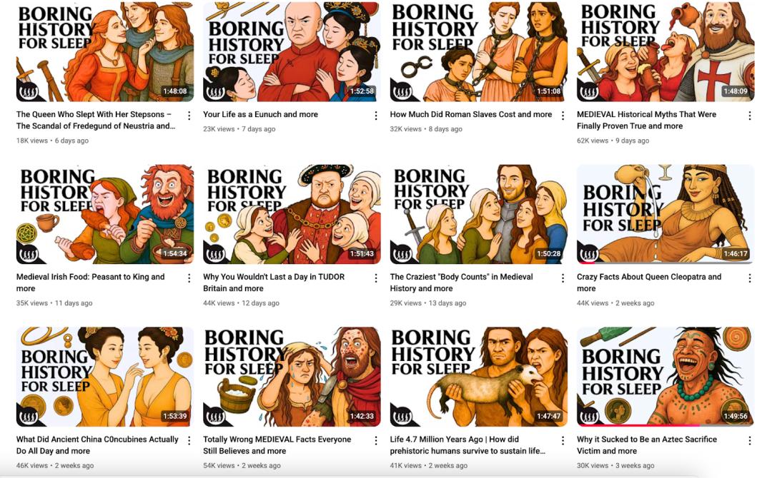 以YouTube为例,只要在平台上以“Sleep”“History”“Boring”为关键词进行搜索,就能发现大量打着“助眠”标签的视频。它们都以慢节奏、平缓的语音语调,把枯燥的历史用高度接近真人的声音朗读出来。