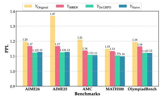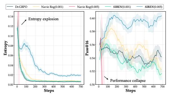 为突破这一瓶颈,团队提出了选择性熵正则化方法(SIREN),通过划定探索范围、聚焦关键决策、稳定训练过程的三重机制,实现了对探索行为的精准调控。实验证明,该方法不仅在多项数学推理基准上取得了显著性能提升,更重要的是,它让模型的探索过程变得更加高效与可控。