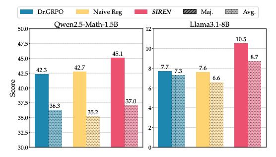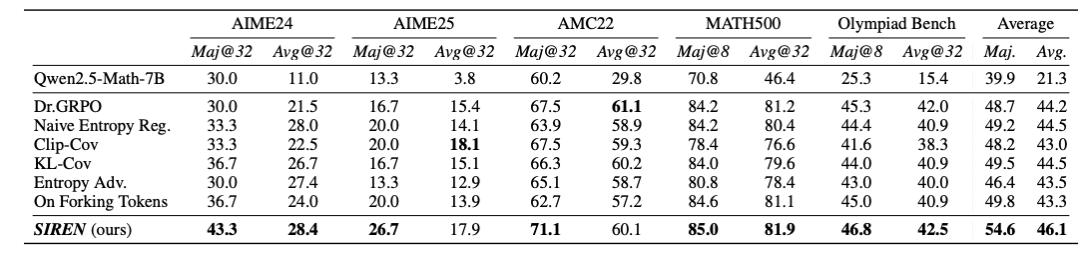 在Qwen2.5-Math-7B上,SIREN平均maj@k达 54.6% ,超越最强基线 4.8% 。