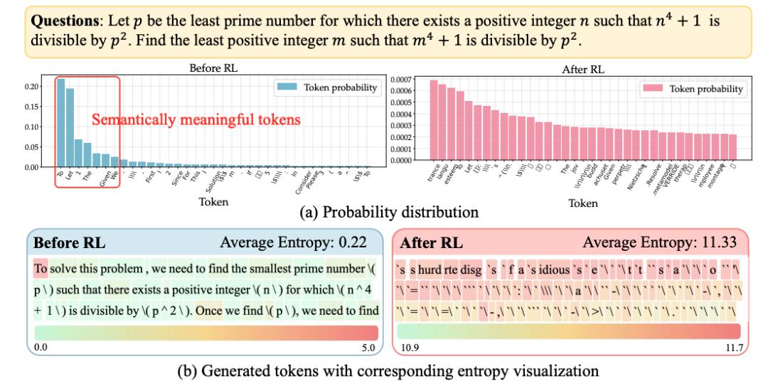 下图表明,训练前模型的概率分布高度集中,且只有少量位置在逻辑上关键,值得探索;过度探索后概率被摊薄,生成内容混乱。
