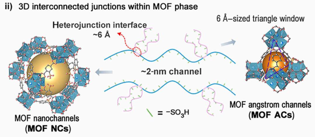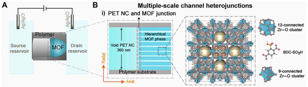 MOF纳流体晶体管装置的结构示意图,可以看到该器件中存在两个尺度的异质结:一是在聚合物纳米孔(左侧灰色管道)与MOF晶体(绿色部分)交界处形成的一维异质界面;二是在MOF晶体内部,由不同结构单元连接形成的三维交界网络(图中绿色晶体内部的黄色界面)。这些层次化的界面与通道共同造就了特殊的离子传输性质