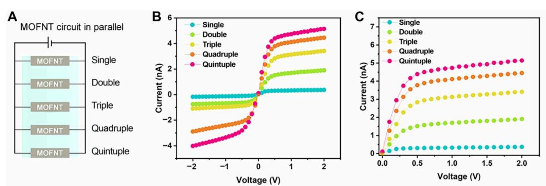 研究人员将制备好的MOF纳流体晶体管(简称h-MOFNT)浸入含不同离子的溶液中,测量其电流-电压特性。