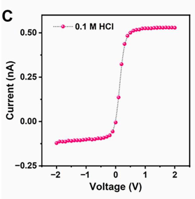 实验结果令人兴奋:当使用盐酸(HCl)溶液时(其中的阳离子主要是质子H⁺),芯片的电流随电压变化呈现出强烈的非线性。