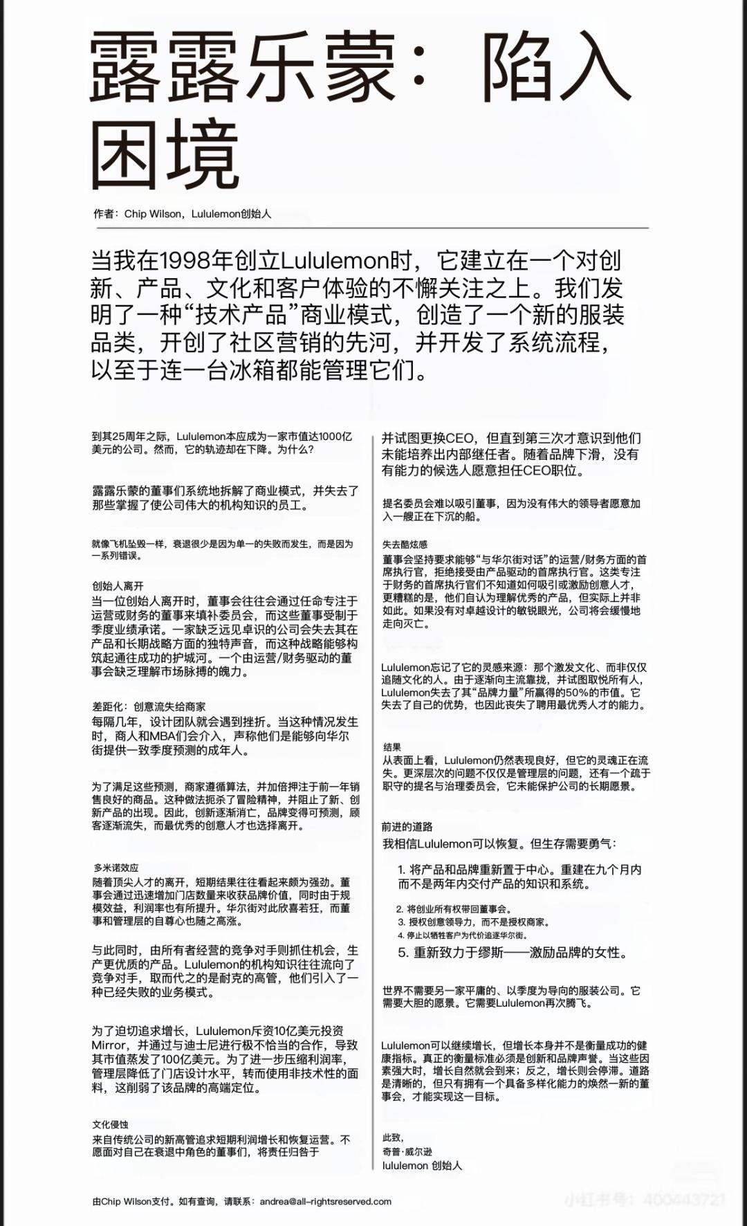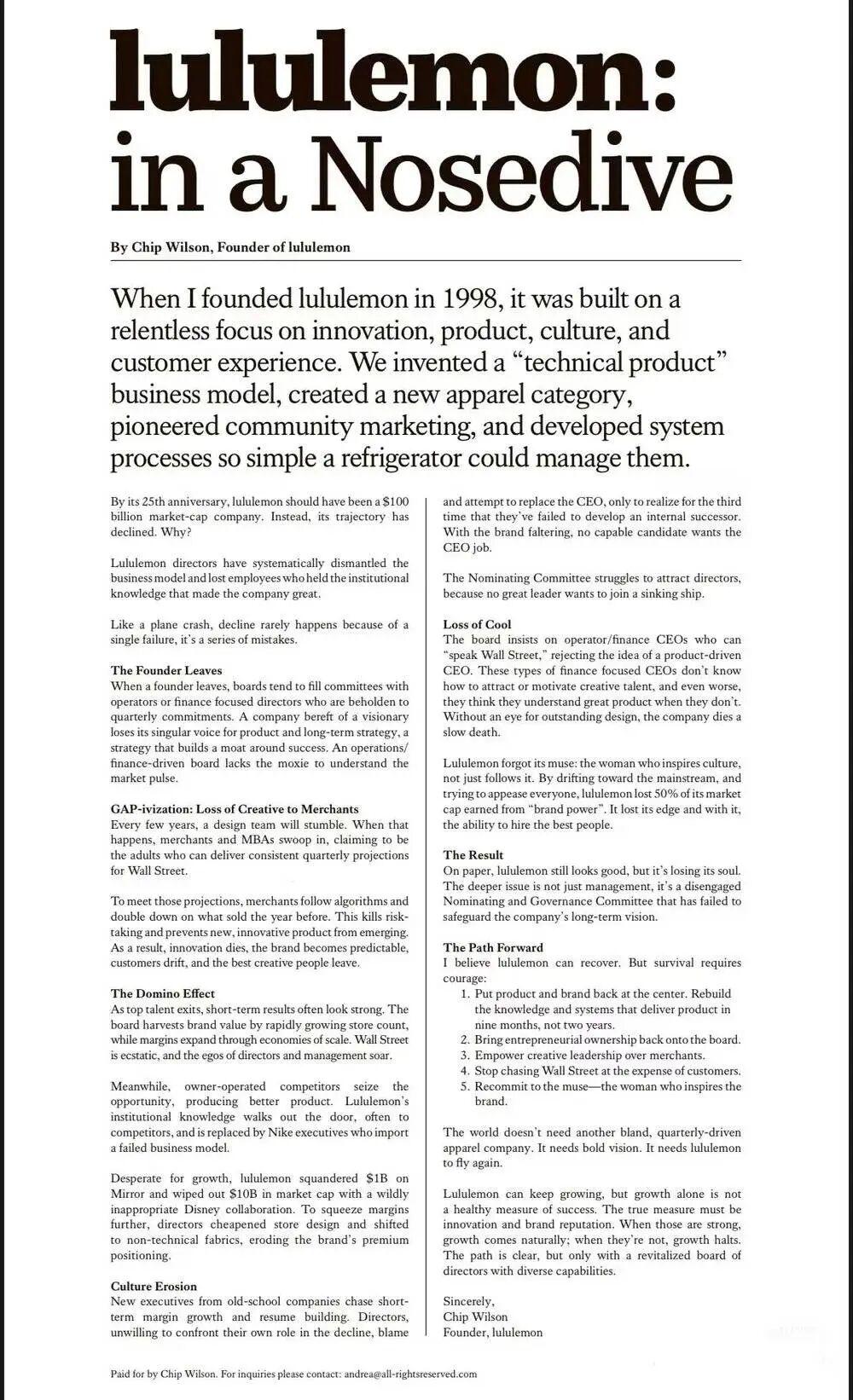 Wilson 自费将这封措辞激烈的信件登上华尔街日报,直言 lululemon 面临设计停滞、生意至上、文化迷失等困境,警告品牌必须要破釜沉舟地进行“灵魂复兴”。