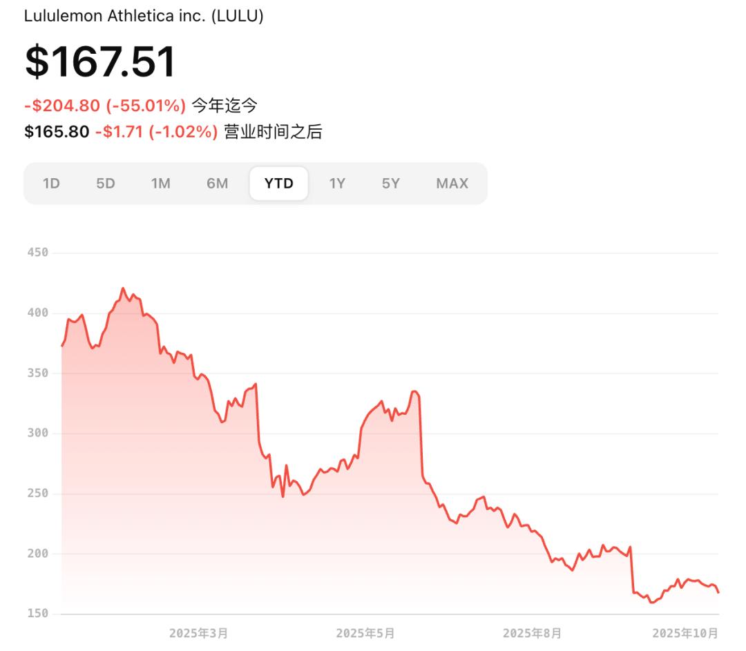 资本市场对此早有感知。开年至今,lululemon 股价下跌超55%,创6年来新低。