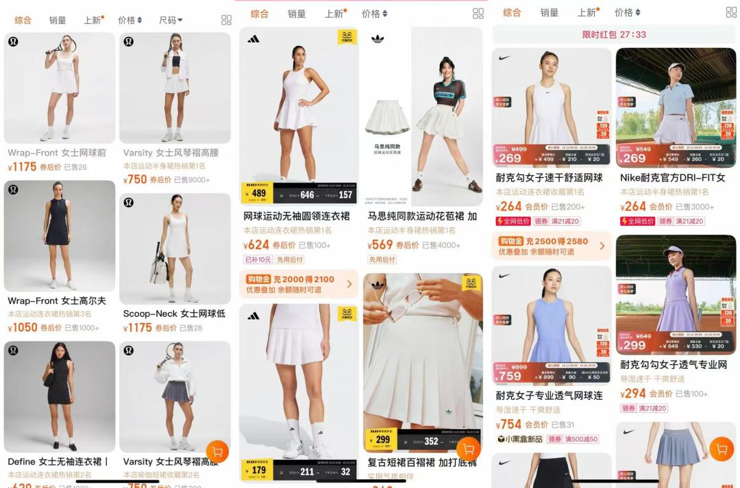 剁椒 Spicy 观察,作为百亿美金三巨头之一,与 Nike、Adidas 相比,lululemon 的定价普遍高出 30%–50%。下图所示,在三者均未构建明显护城河、竞争力相当的网球裙赛道,lululemon 热销连衣裙均价1000+,半裙700+;Adidas 长裙600+,半裙500+;Nike 最热销的一款网球连衣裙原价499,双十一折后仅269元。
