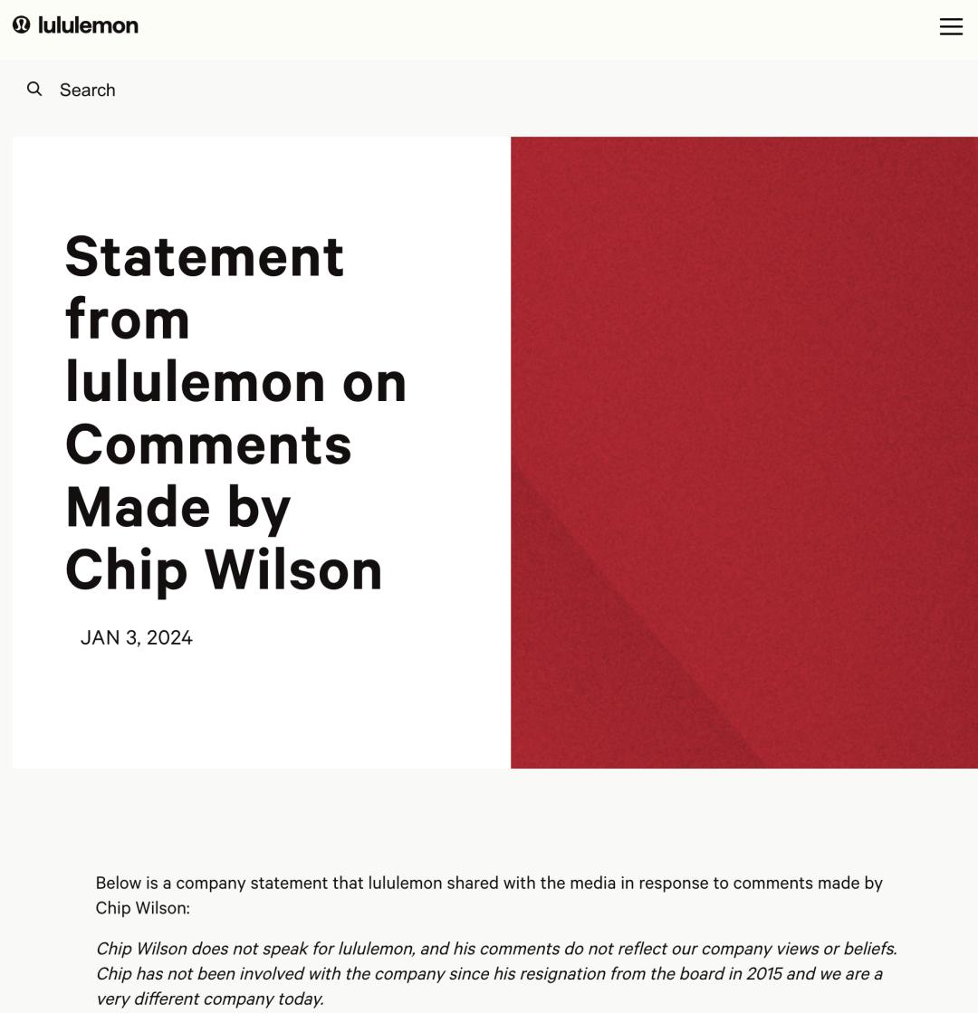 2024年1月,lululemon 官方发声明称,“创始人早已不能代表 lululemon 的立场和利益。今日的 lululemon 也早已不是2015年 Chip 离开时的 lululemon。”