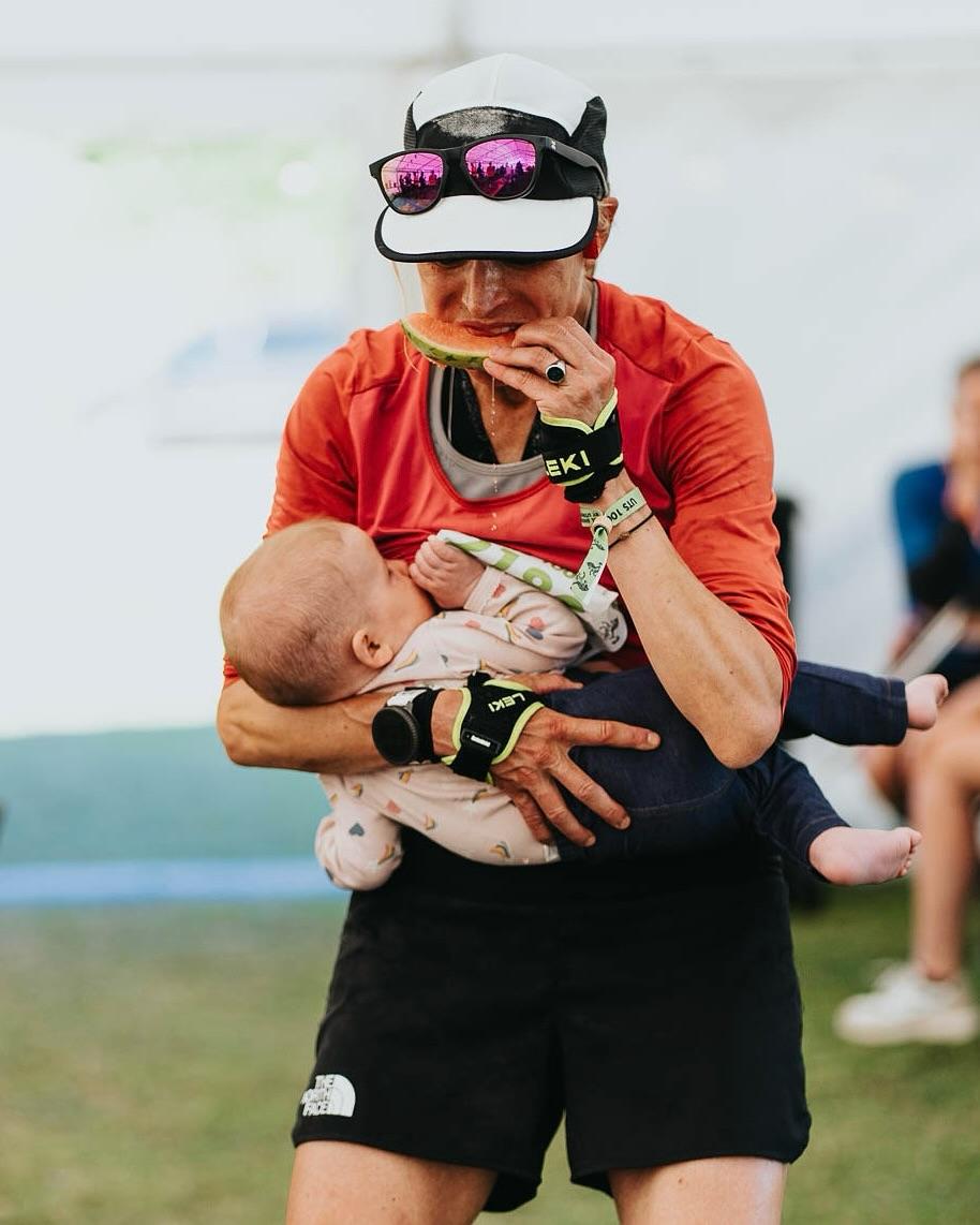 而今年的UTMB世界系列赛斯诺登尼亚超级越野赛中,夺得百公里女子冠军的加拿大选手Stephanie Case,在CP站里一边怀抱着六个月的女儿,一边狼吞虎咽地吃着西瓜的画面,也让人们看到一种温情而崇高的「运动之美」。