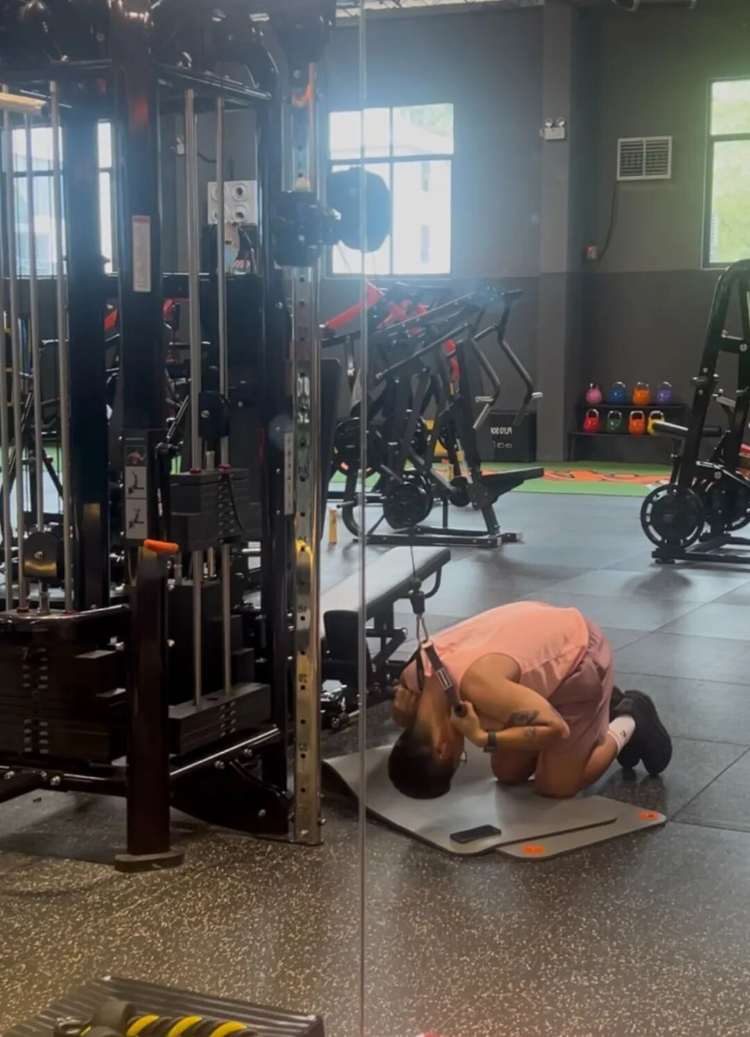 埋头做哈克深蹲的动作固然丑陋,跪姿绳索卷腹的社死恐怕无人能及,「每次都要专门挑四下无人的时候练习这个尴尬的丑动作,以防被误认为在给别人磕头。」