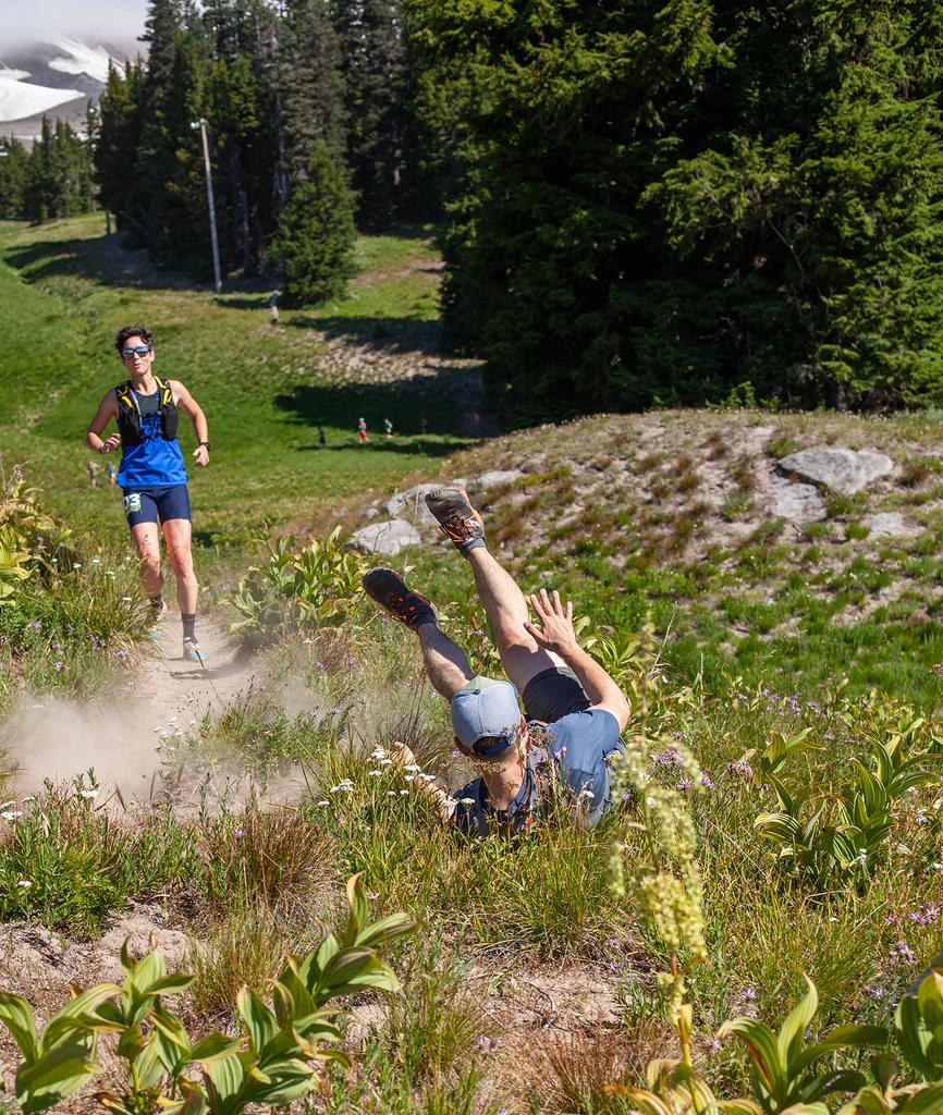 就拿越野跑中最让人丑态百出的「屁降」为例。面对陡下坡时,不少人把「屁脚并用」视为一种无奈的选择,「在丢人和速降之间,选择了一边丢人一边速降」。