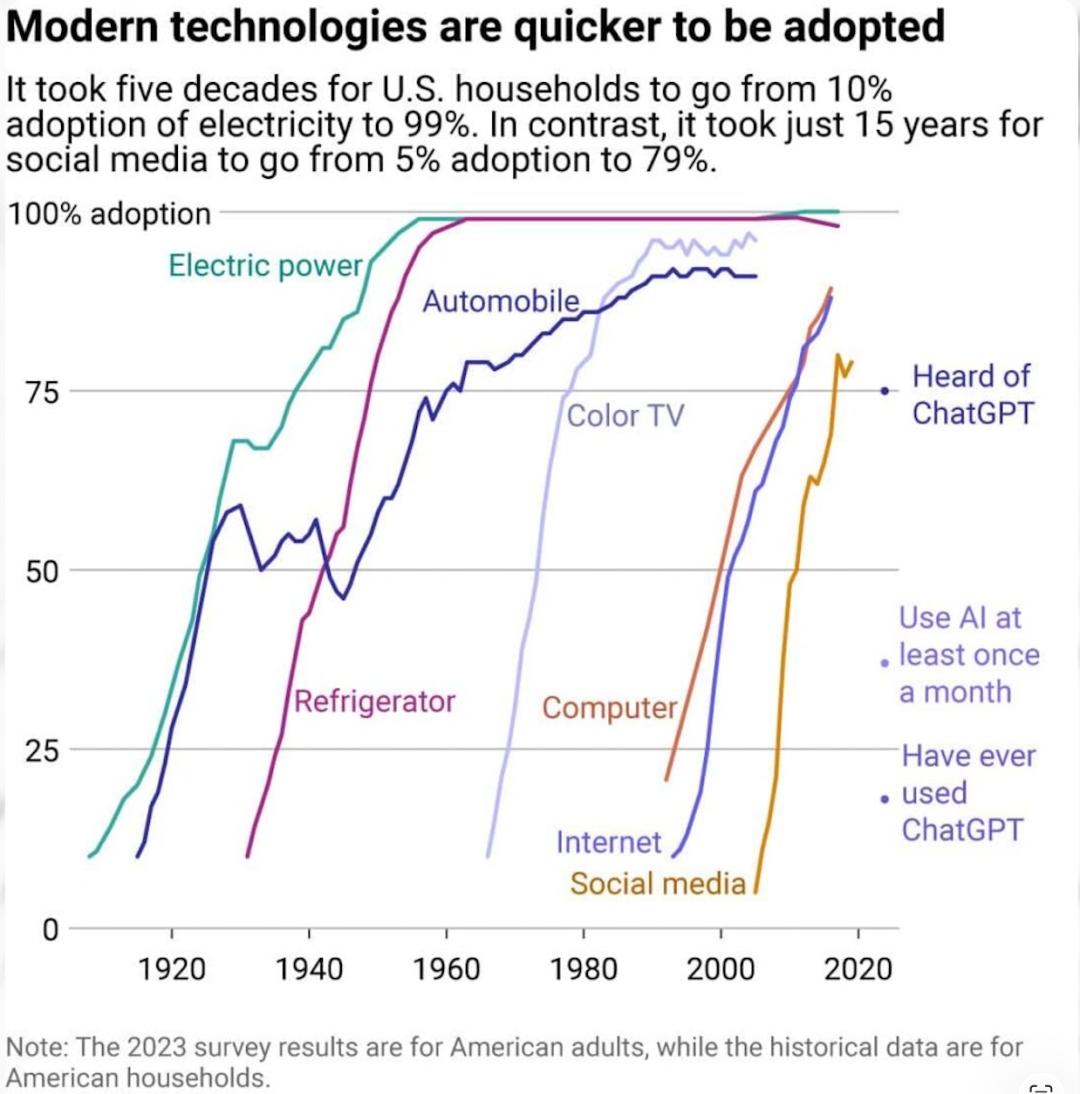 相比历史上其他的技术革命,电力、自动驾驶、压缩机、互联网、电脑、社交媒体等,AI技术被「采纳」的速度是「有史以来」最快的!