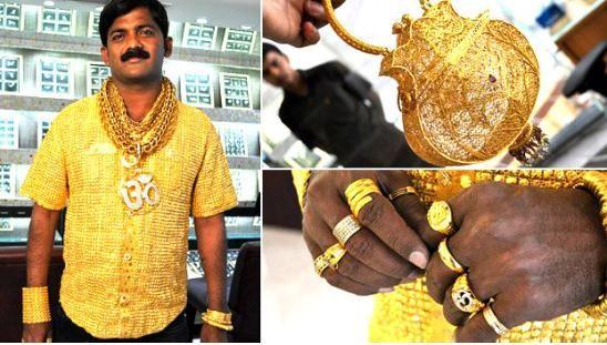 2013年时,还有位印度富商,打造了一件重达3.5公斤的黄金衣,他穿着金衣,浑身戴满金戒指、金项链,然后在几个保镖的护卫下,跑到贫民窟去炫富,好不神气。说句题外话,后来有一天,他出门忘了带保镖,结果被一群歹徒活活围殴至死。