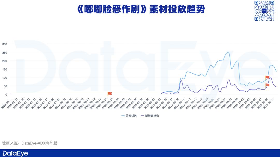 从《嘟嘟脸恶作剧》素材投放趋势可以看出,其在9月上旬开始进行素材投放,并在上线当天加大投放力度。