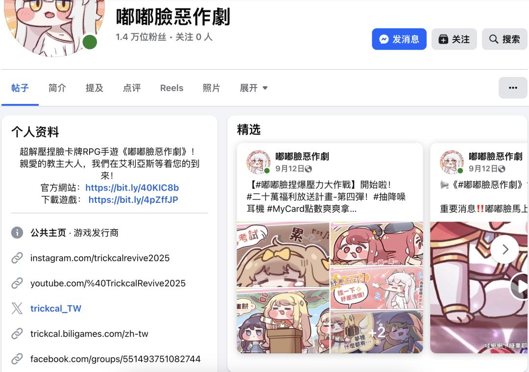 在FaceBook平台,《嘟嘟脸恶作剧》主要是推送发放福利、真人网红传播以及相关角色介绍等传播内容。