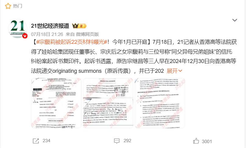 同期,宗庆后的三名私生子女(宗继昌、宗婕莉、宗继盛)在香港、杭州提起诉讼,争夺百亿遗产,家族内斗彻底公开化。