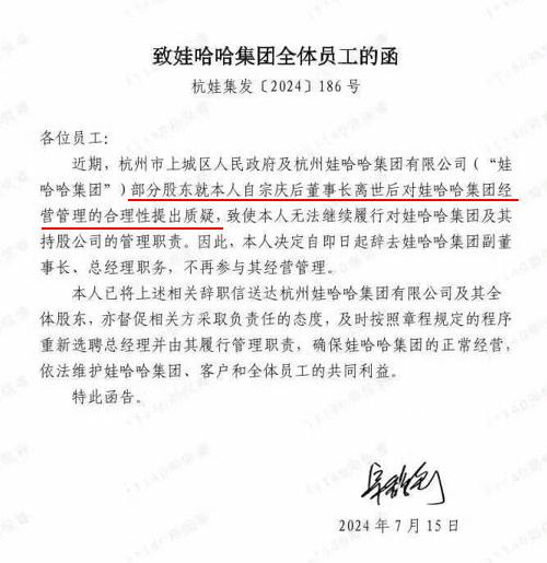第一次离职一周后,随后在2024年7月22日,娃哈哈集团发布声明称:“为确保公司平稳健康发展,经各股东友好协商,宗馥莉决定继续履行相关管理职责”。