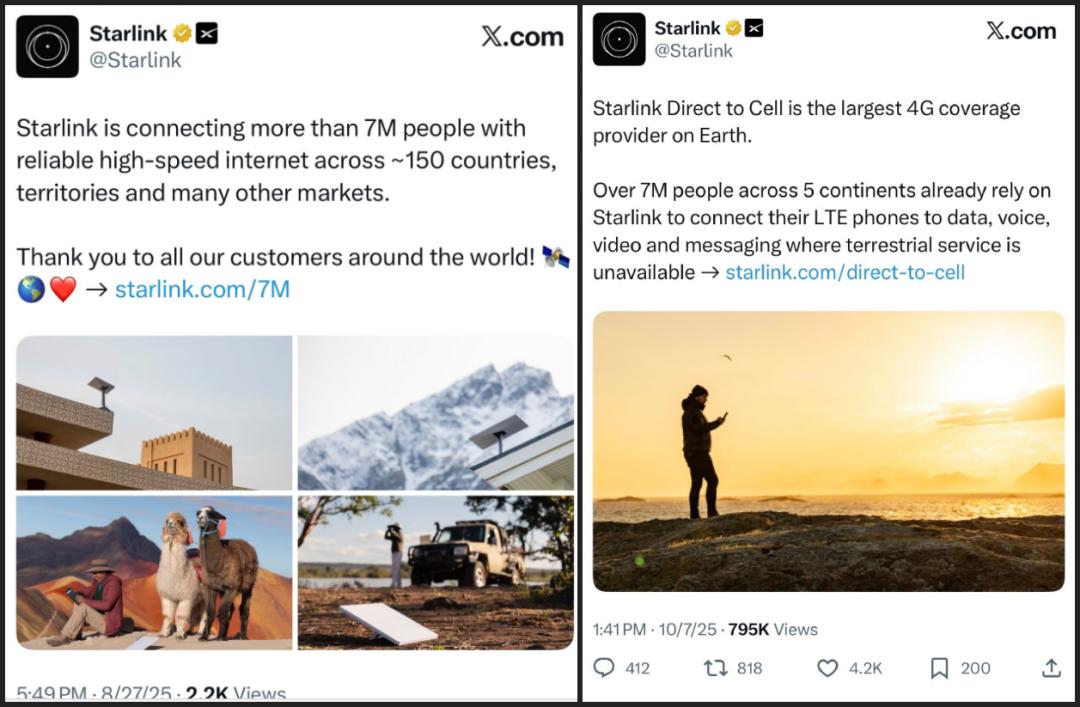 星链宣布终端用户超700万,还有700万手机直连用户 | 星链官X截图
