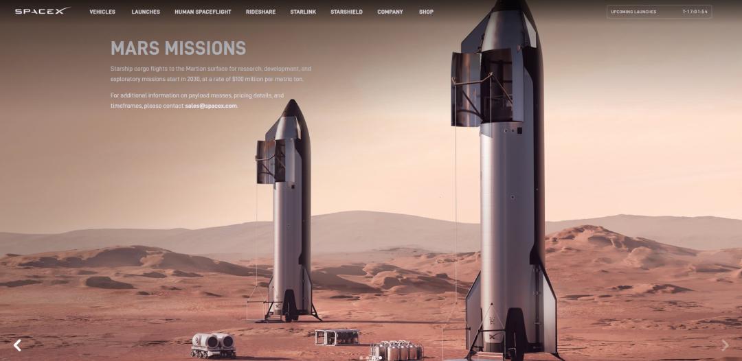 因此,在SpaceX最新的官网页面上,火星货运任务的开启时间被设定在了2030年,运费同样是“童叟无欺”的每吨1亿美元。