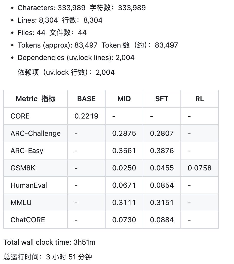 Karpathy 认为 nanochat 也有潜力像 nanoGPT 一样,逐渐成长为一个 研究平台或标准基准。它现在还远未算完美,也没有特别调优或性能优化(他认为很接近了)。不过,整体框架已经成型,因而适合放到 GitHub 上,让社区协同迭代改进每个模块。