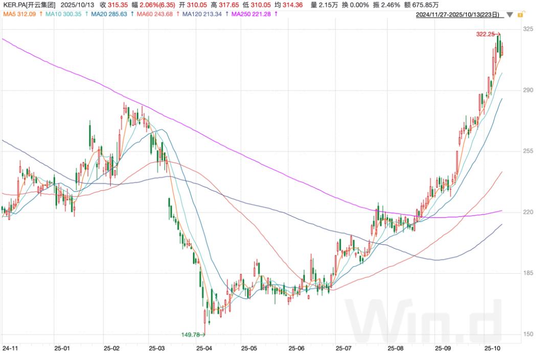 进入今年二季度后,著名奢侈品品牌Gucci的母公司,法国开云集团(以下简称:开云)的股价持续暴涨,从4月7日至10月13日,区间涨幅超过了82%,并在同期的法国CAC40指数成分股中领涨。就在本轮行情之前,开云的股价从2021Q3到2025Q1这三年多的时间里,一直处于震荡下行中,这期间的股价跌去了约80%,可以说是“斩到了脚踝”。