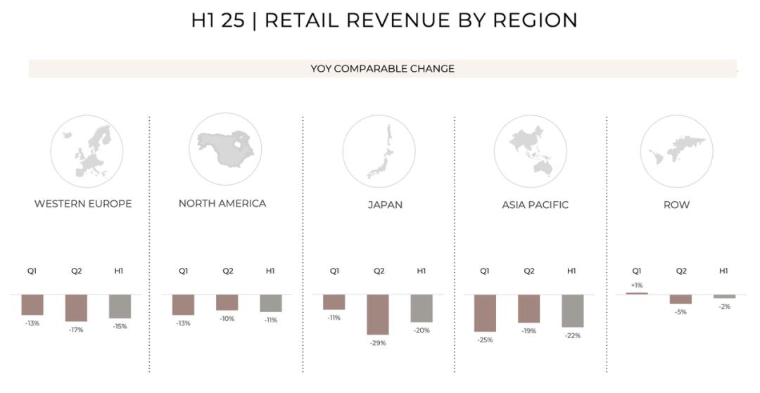 因此,截至今年上半年,开云收入占比前三大区域分别是西欧、亚太和北美,三者合计约占公司收入的82%。参考今年前两个季度各区域收入可比口径下的边际变化趋势,西欧的收入占比虽然已经与亚太持平,但受旅游业疲软拖累,Q2的收入同比在边际变差;亚太与北美的收入同比在Q2虽然出现了一定的边际好转,但本身收入同比负增长的程度都较深。