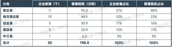 分类来看,管理榜TOP30中,分别有11家房企系住房租赁企业、10家地方国企系、5家创业系、3家酒店系、1家中介系。与开业榜单类似,管理规模榜TOP30企业中,房企系规模优势稳固,管理规模在TOP30中的占比接近五成;地方国企系占比达23%,创业系、酒店系占比均在10%以上。