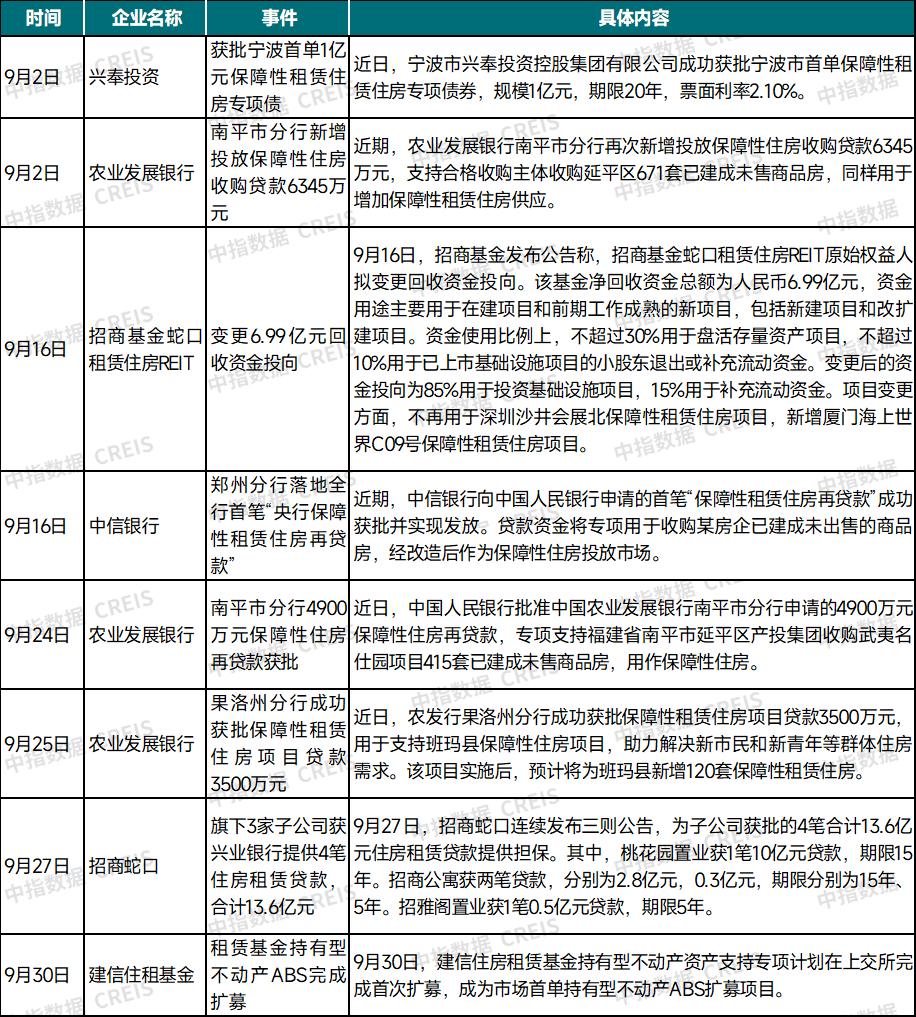 9月,住房租赁信贷支持持续推进落实。宁波兴奉投资获批宁波首单1亿元保障性租赁住房专项债,招商蛇口旗下3家子公司获兴业银行提供4笔合计13.6亿元住房租赁贷款。资产证券化方面,招商基金蛇口租赁住房REIT变更6.99亿元回收资金投向,建信住房租赁基金持有型不动产资产支持专项计划在上交所完成首次扩募,成为市场首单持有型不动产ABS扩募项目。