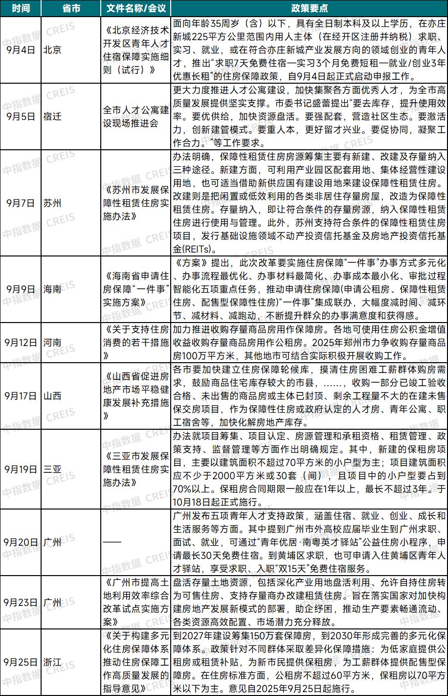 表:2025年9月地方出台的住房租赁市场指导与支持政策