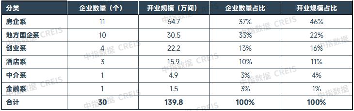 分类来看,开业榜TOP30中,分别有11家房企系住房租赁企业、10家地方国企系、4家创业系、3家酒店系、1家中介系、1家金融系。其中,房企系开业规模领先优势突出,合计占比达46%;地方国企系开业规模持续增长,合计占比超20%;创业系、酒店系开业规模占比也均在10%以上。