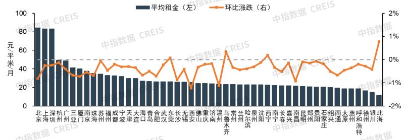 图:2025年9月50个城市住宅平均租金及环比涨跌