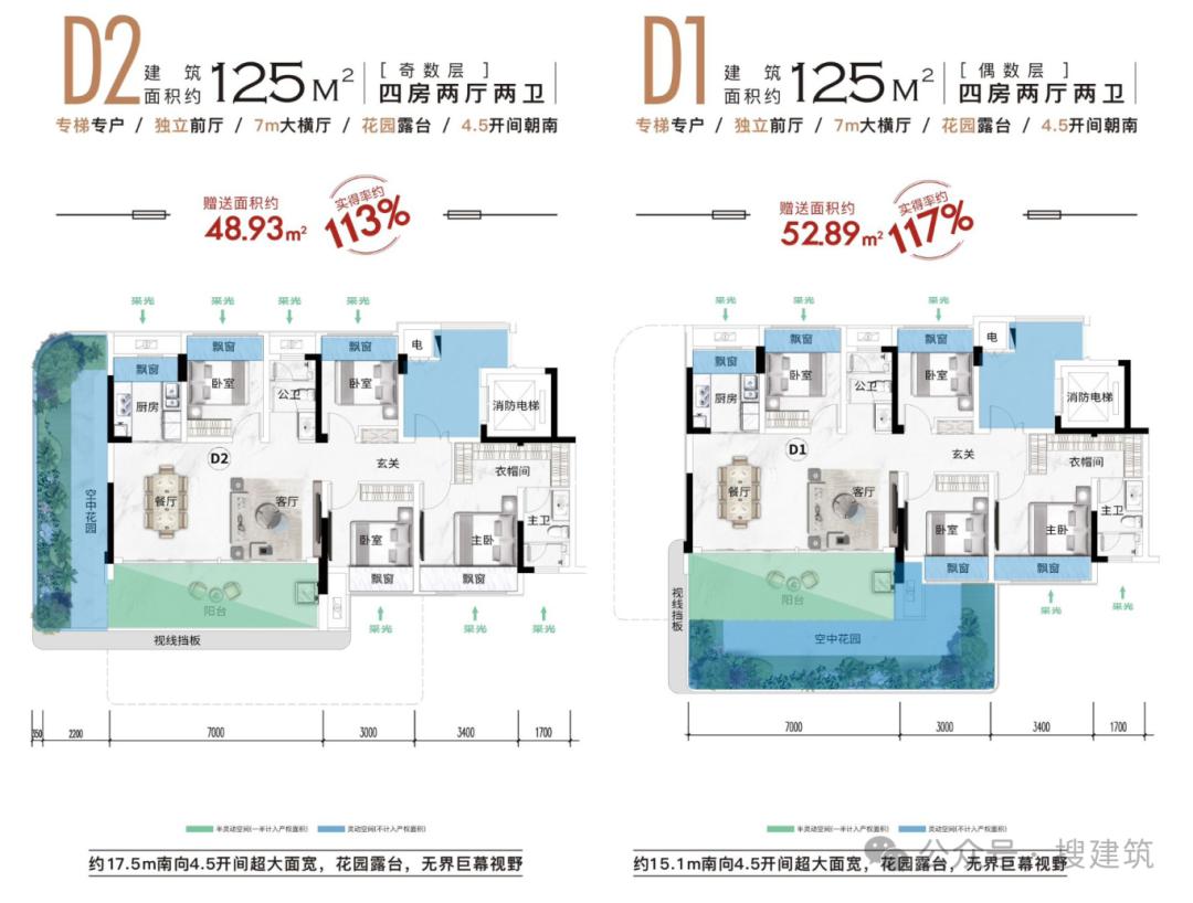 比如武汉城建和金地合作的某项目,奇数层边户118㎡户型,加上赠送的空中花园、飘窗以及半赠送的阳台,赠送面积合计约37平米,最高得房率约112%,实用面积跟市面上160平米的户型相当。