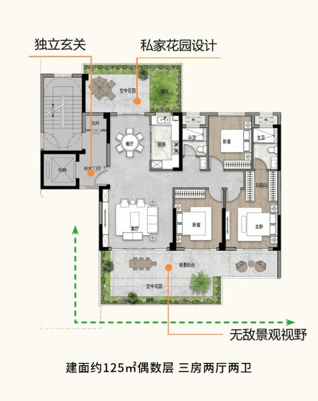 有些项目也会在入户处打造空中花园,形成双归家动线。