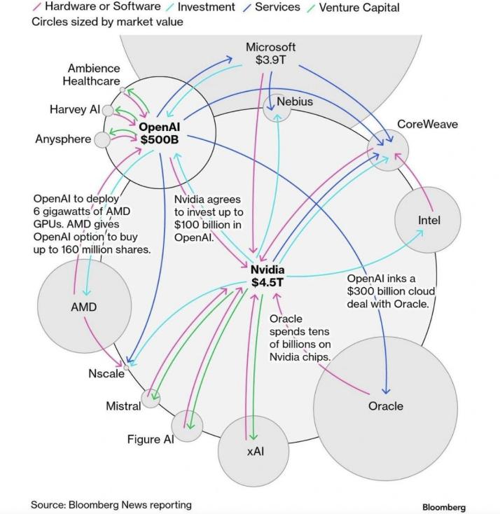 在接连发生的AI投资事件中,有人注意到OpenAI正在通过一系列芯片、数据中心建设、AI技术服务的订单,形成了一整套闭环的价值链。参与到OpenAI合作的玩家们,正在组织起一个系统性的AI建设联盟。