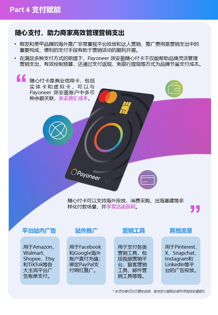 另一方面,针对假发和美甲这类高度依赖达人营销与社交投放的品类,Payoneer 派安盈提供了一款付款利器 Payoneer 派安盈随心付卡,在集合了多币种外币原币高效支付同时,还能享受高额返现政策,能显著帮助品牌商户控制成本并提升营销支出的管理效率。
