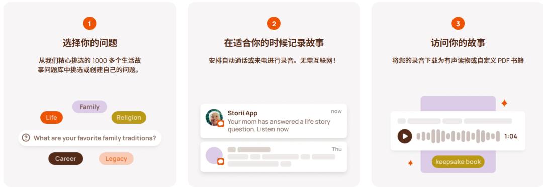 每周接听 AI 助手拨打的3次电话,在1000多个精心设计的问题引导下,老人通过 Storii 讲述自己的回忆。