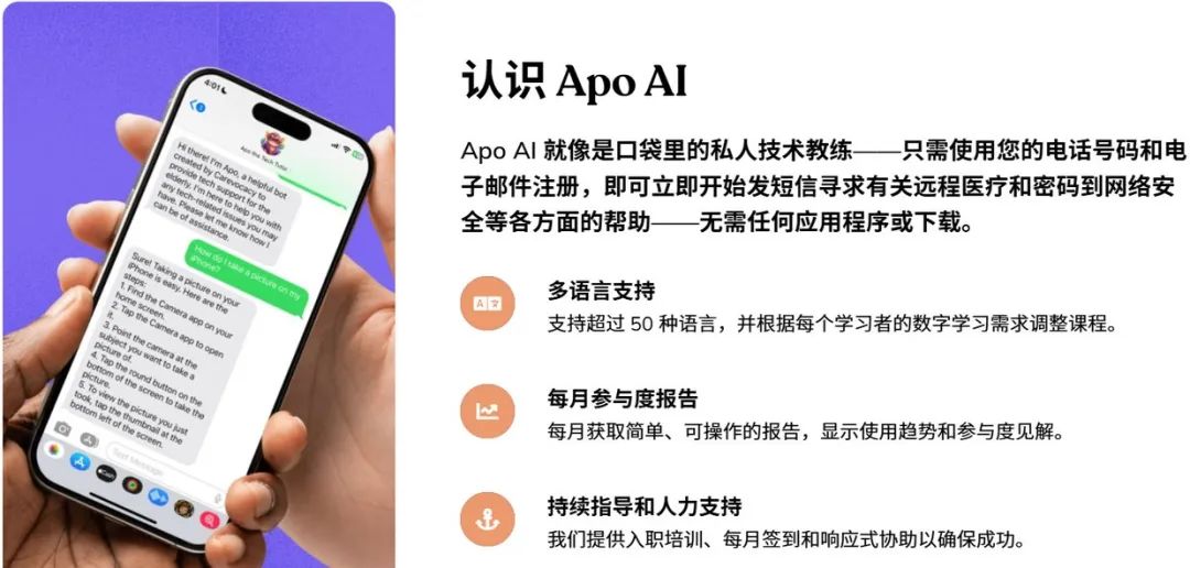 老年人无需下载任何 App,仅通过简单的短信,向聊天机器人 Carevocacy 发送问题,即可了解远程医疗、手机使用、网络安全、食物订购等各类技术难题。