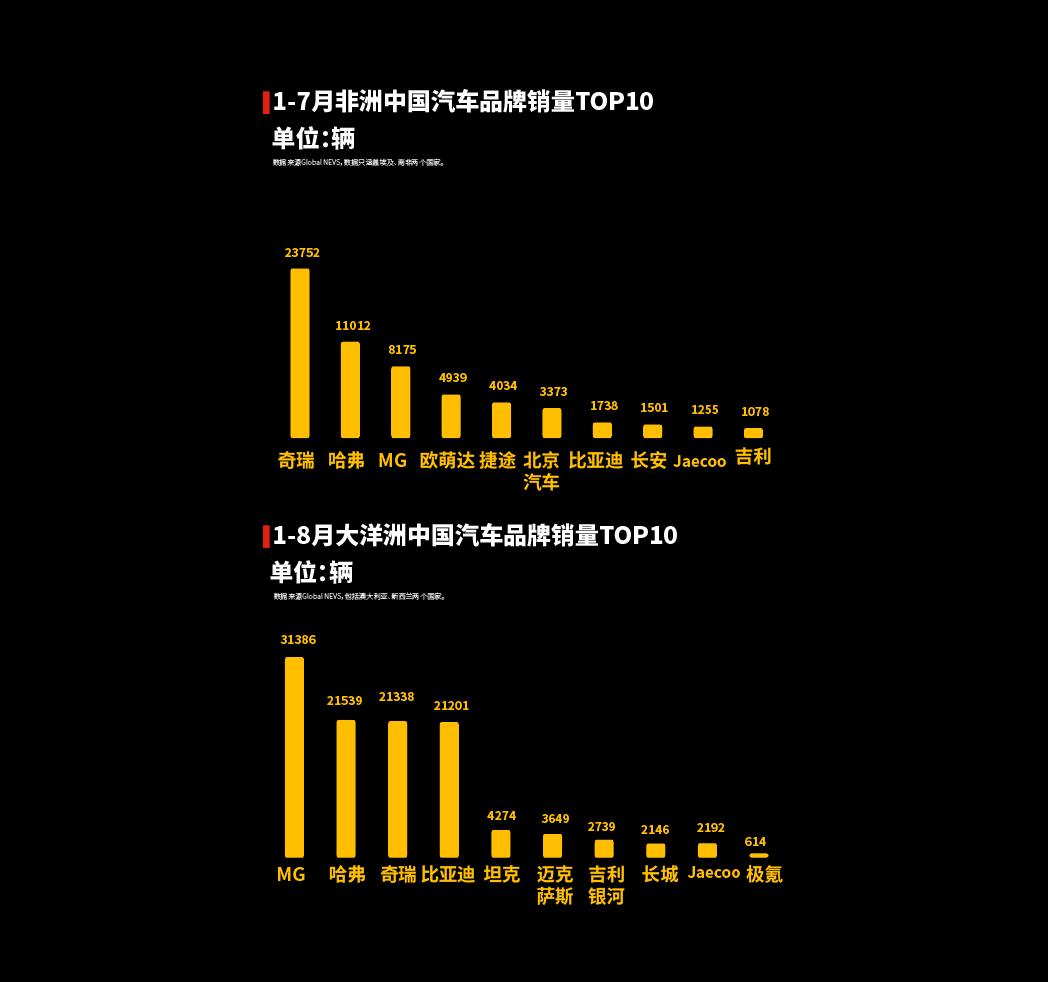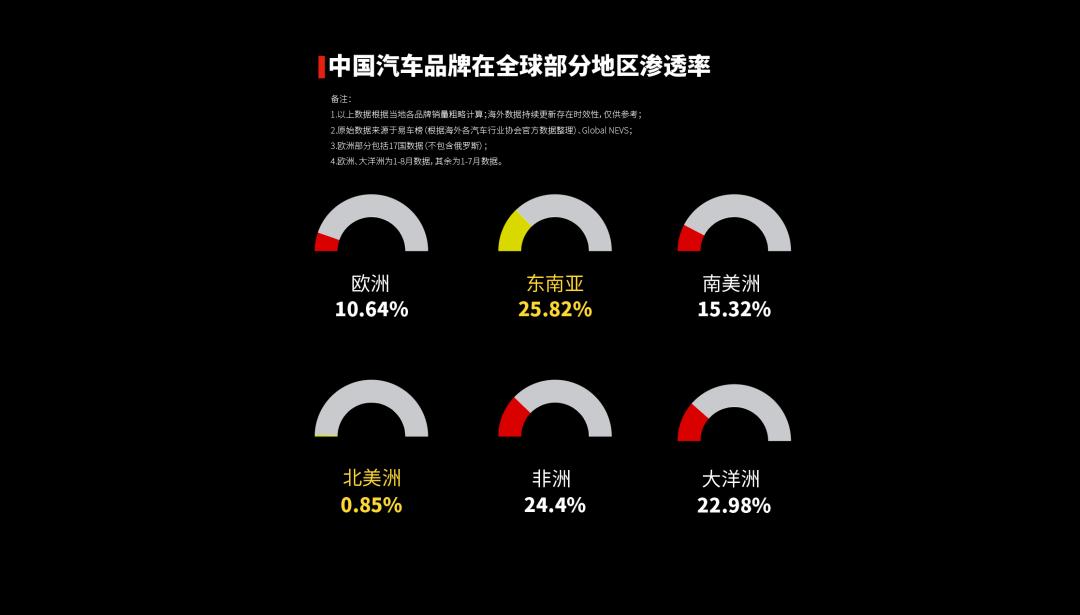 虽然澳洲和非洲汽车市场的整体规模不大,但是从渗透率数据来看,在这些汽车工业原本就不发达的地区,中国品牌拥有着更多机会。